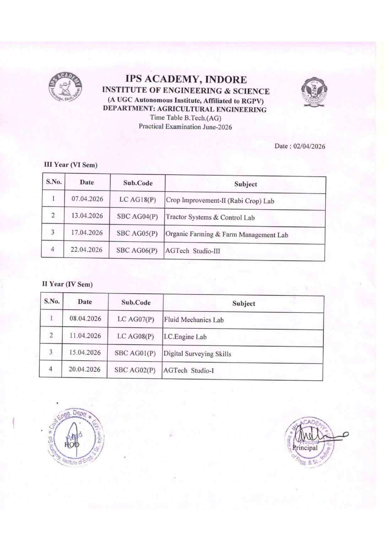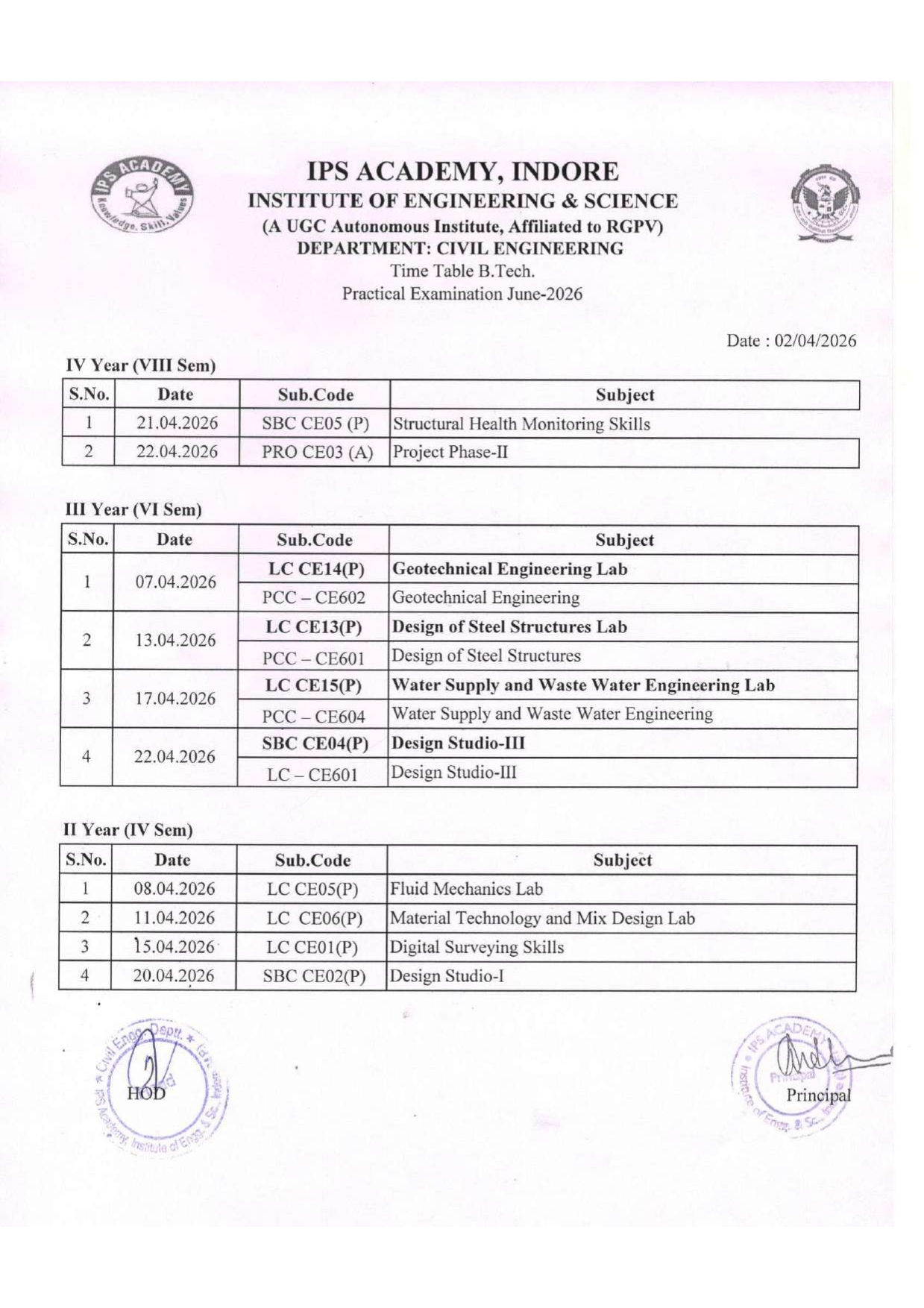 B. Tech External Practical Time Table Examination June 2026