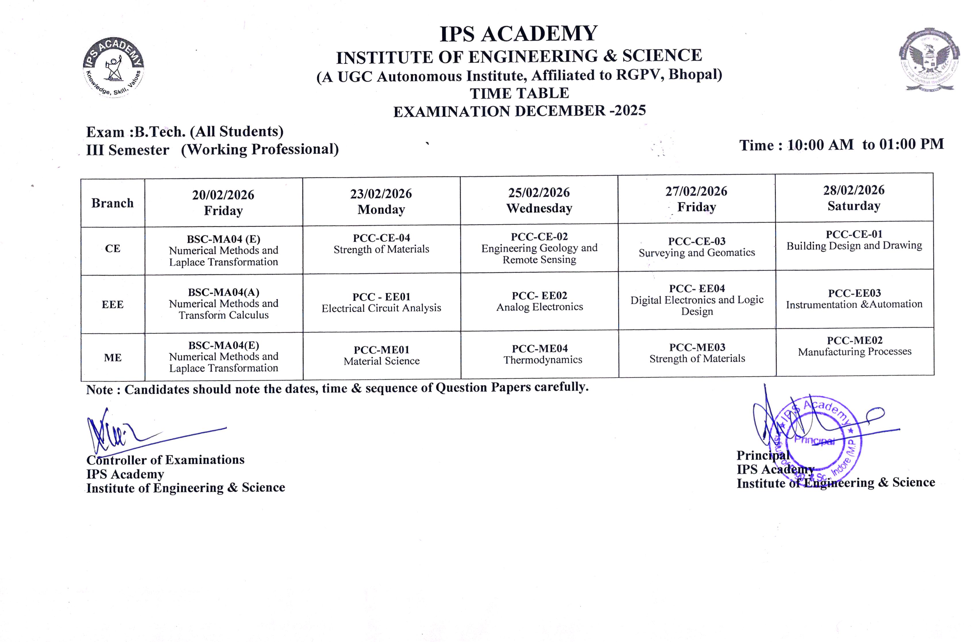 B.Tech III Semester [Working Professional] Examination Dec-2025 Time Table Posted on February 13, 2026 by Admin