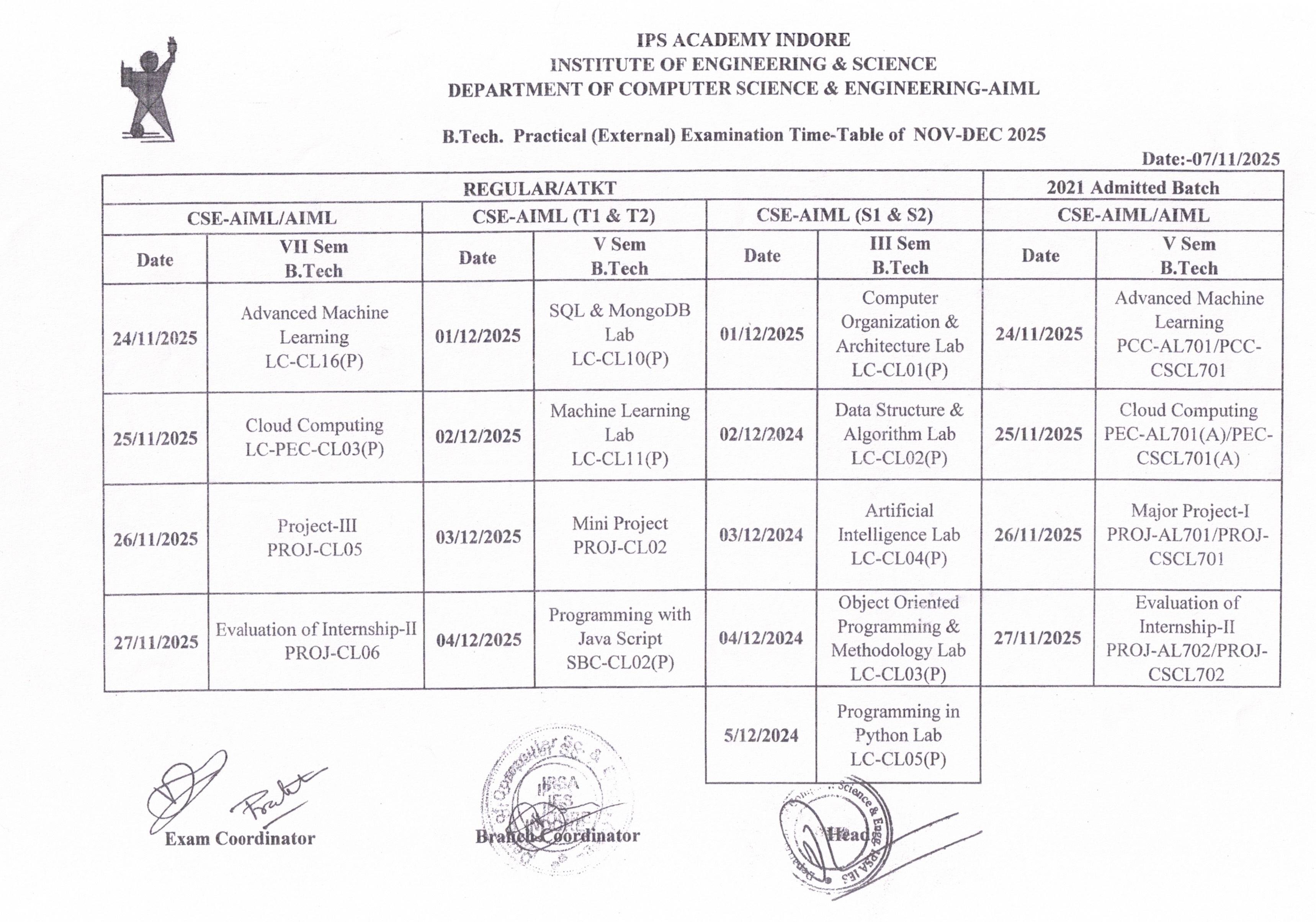 External Exam Practical Time Table Dec 2025 – Regular/ATKT/BA Group Posted on November 12, 2025 by cseaiml External Exam Practical Time Table Dec 2025 – Regular/ATKT/BA Group – Click here