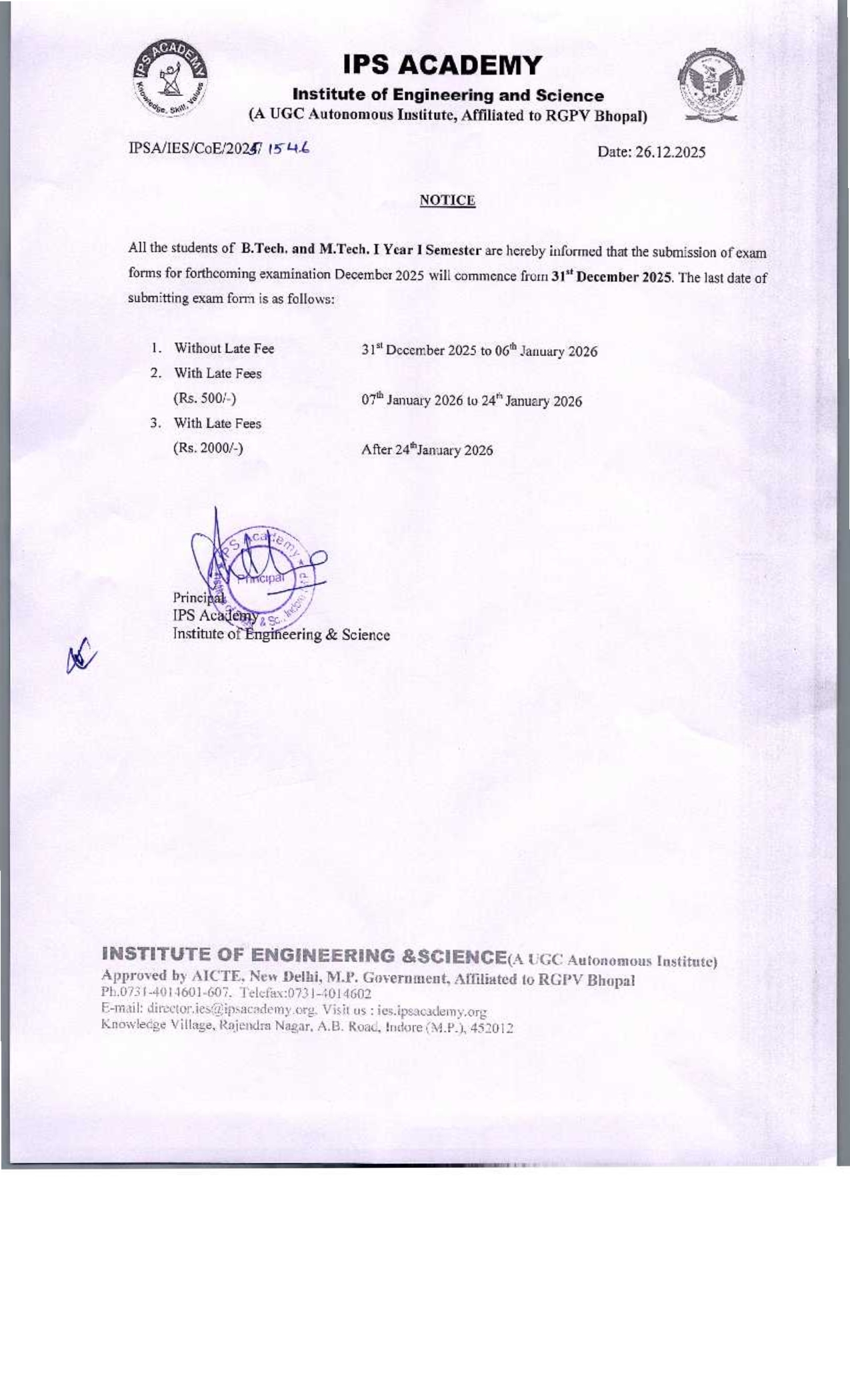 Notice Regarding Date of Submitting Exam Form for B.Tech I Year (Reg & ATKT) & ME/M.Tech I Year(Reg & ATKT) for Examination Dec 2025 Posted on December 27, 2025December 29, 2025 by Admin