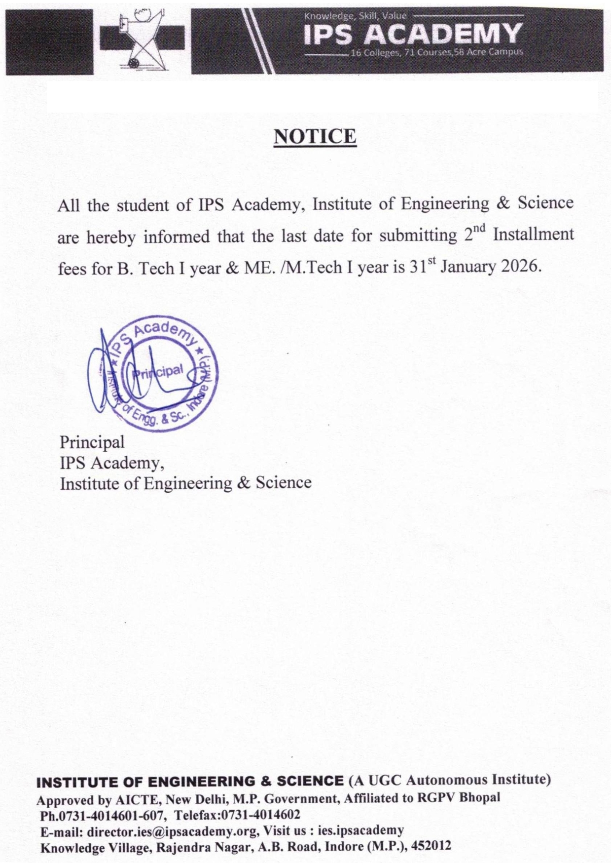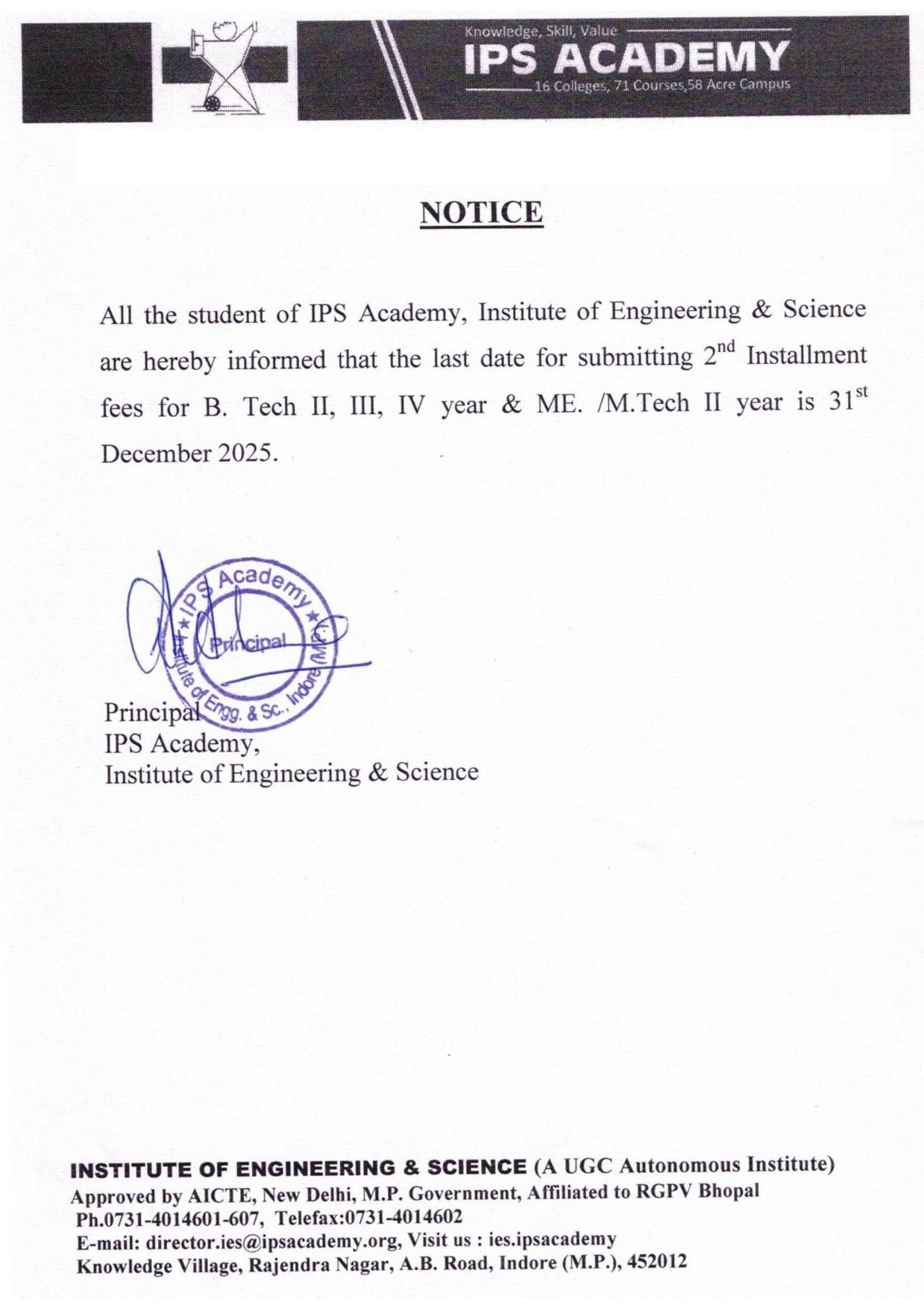 Notice Regarding Last Date of Fees Submission of 2nd Installment for B.Tech. I, II, III and IV Year & M.E/M.Tech I, II Year Posted on September 25, 2025December 6, 2025 by Admin B.Tech. I Year & M.E/M.Tech I Year ————————————————————————————————————————————————— B.Tech. II, III and IV Year & M.E/M.Tech II Year